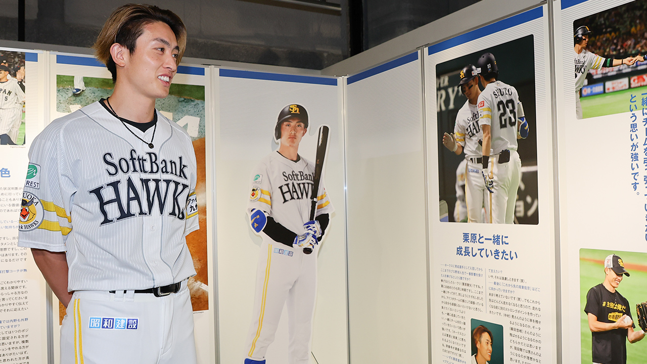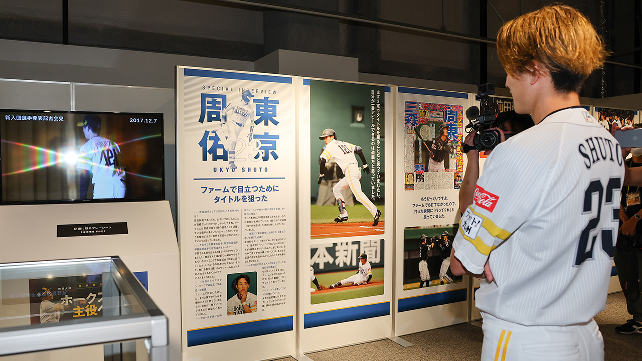 開催初日、周東佑京選手が企画展を訪問。自身のプロ初盗塁の映像を見つけると「覚えています。めちゃくちゃ緊張しました」と当時のことを振り返っていました。また、栗原陵矢選手との試合中の2ショット写真が大きく掲載されたパネルに思わず立ち止まり「これグータッチしているように見えますけど、ただ目薬渡しているだけです」と周囲を笑わせていました。