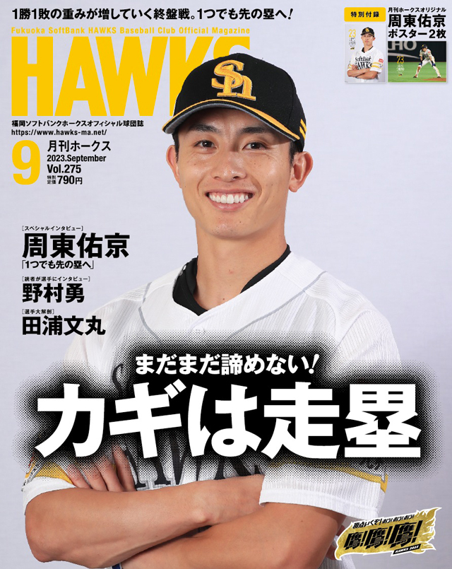 見どころ満載の9月号は、月刊ホークスオリジナル「周東選手ポスター2種類」が付いて特別定価790円で全国書店にて発売中!