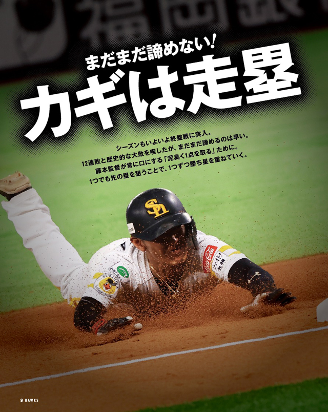 シーズンはいよいよ終盤戦に突入。そこで、9月号のテーマは「走塁」。藤本博史監督が常に口にする「泥臭く1点を取る」ために、1つでも先の塁を狙うことで、1つずつ勝ち星を重ねていこう!