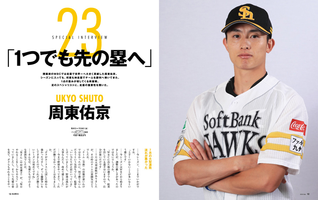 巻頭特集では、周東佑京選手にインタビューを行いました。何度も神走塁でチームを勝利に導いてきた周東選手。「1ヒットで三塁まで進む。ヒット1本でホームまで還って来られる。そういうことが大事。1つでも先の塁に行けば作戦も変わってきますし、点が取れる確率がどんどん上がってくる」と、走塁の重要性をたくさん語ってくれています。