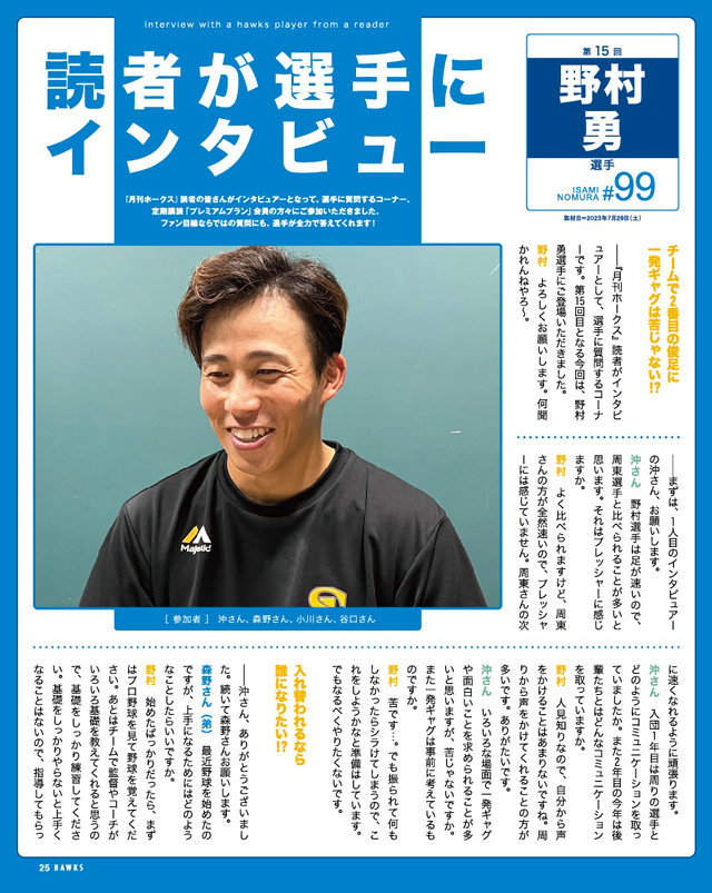 月刊ホークス定期購読プレミアムプランにご加入の読者がインタビュアーとして選手に質問する「読者が選手にインタビュー」。今回は野村勇選手に登場してもらいました。ファンならではの質問に、全力で答えてくれています!