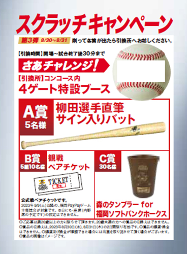 また柳田選手のコメント入りインフォマーシャル映像を試合間CM中に場内ビジョンで放映致します。