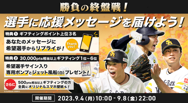 - (2)特典(1)+30,000pts相当以上のデジタルギフトをギフティング、かつ、ギフティング額上位1位~3位の方に、希望選手サイン入り専用ポンプ+ジェット風船をプレゼント。