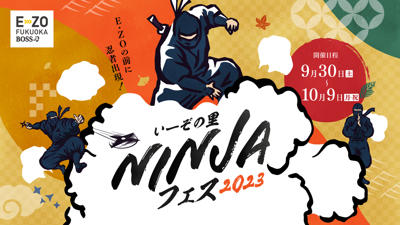 E・ZOの秋は忍者の秋?!9月30日(土)~10月9日(月・祝)の期間限定で、BOSS E・ZO FUKUOKAの前に忍者の里が出現!手裏剣投げやくない投げ、忍者ショーなど忍者にまつわるイベントが盛りだくさん!忍者になって写真撮影も☆