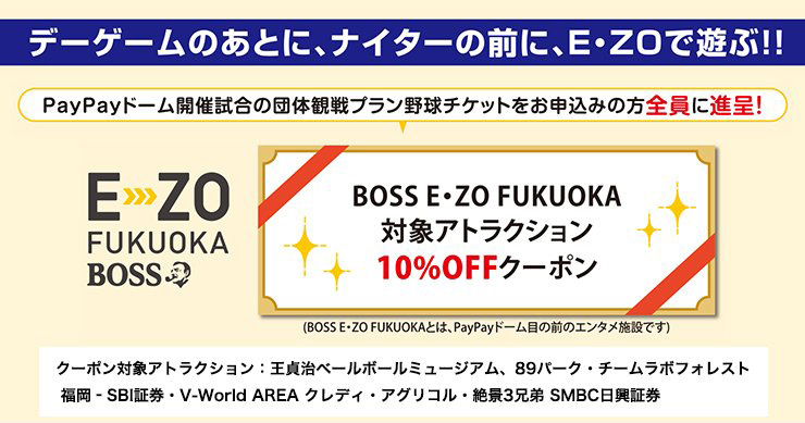 「2023 パーソル クライマックス パ」のPayPayドーム開催試合の団体観戦プラン野球チケットをお申込みの方全員に、団体チケット1枚につき「BOSS E・ZO FUKUOKA対象アトラクション10%OFFクーポン」1枚を進呈します。