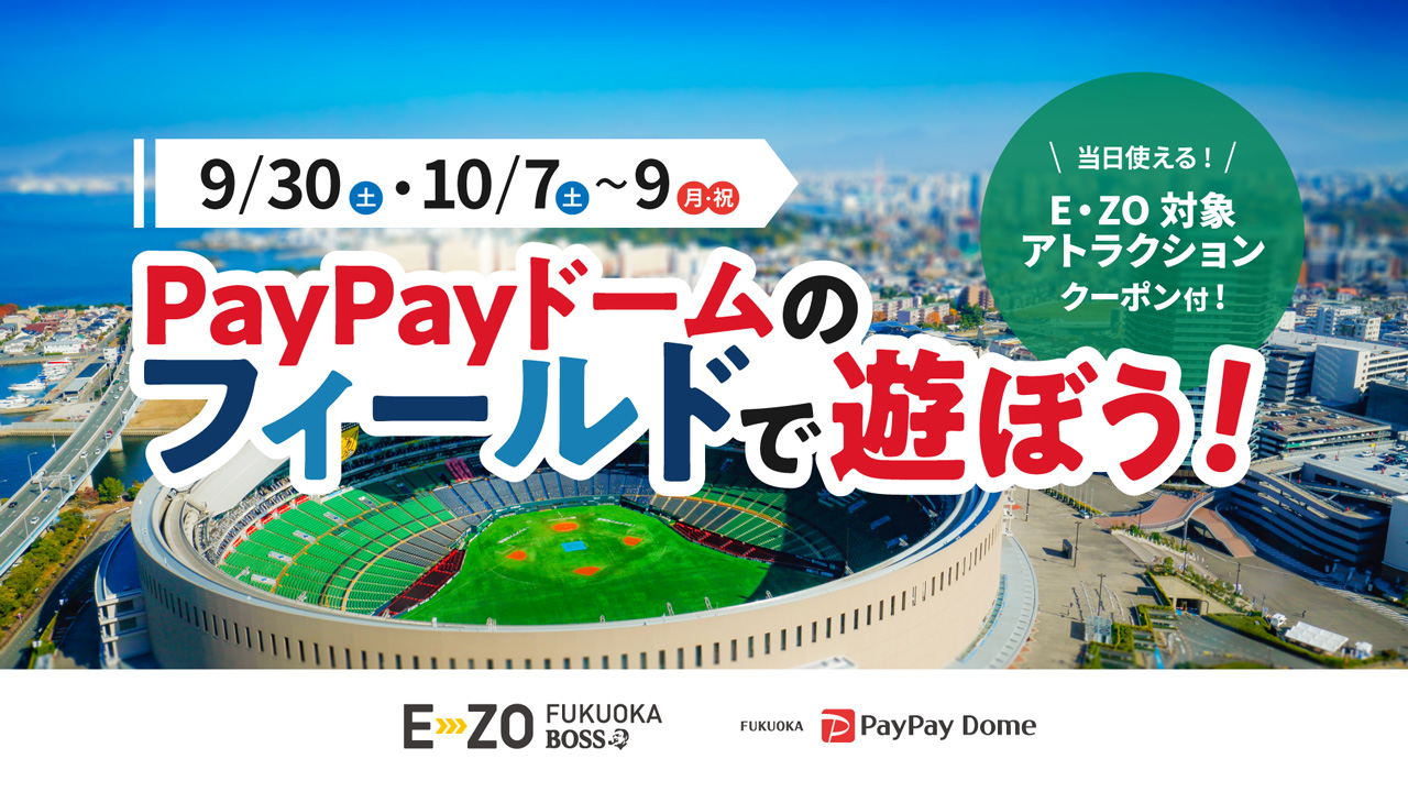 スポーツの秋は、PayPayドームのフィールドで遊ぼう! 9月30日(土)・10月7日(土)~9日(月・祝)の4日間の限定で開催!キャッチボールや写真撮影などをお楽しみいただけます♪ご参加いただいた皆さまには、BOSS E・ZO FUKUOKA対象アトラクションが500円引きになるクーポンをプレゼントします!