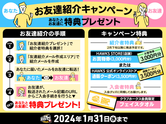2024年1月31日(水)までに、クラブホークスにお友達をご紹介いただいた方と紹介にて入会いただいたお友達にプレゼントを差し上げます!