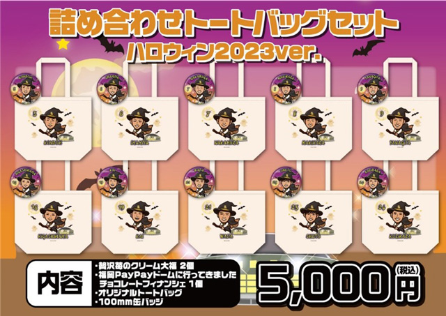 人気グッズ「若鷹ガチャ」キャラクターのお菓子詰め合わせトートバッグセットが新登場!選手がハロウィンに扮したデザインです。