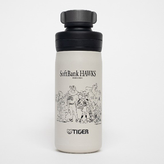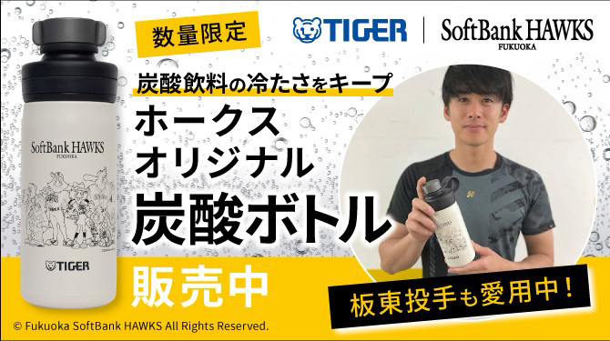 炭酸飲料、ビール等のアルコールも入れることができる「ホークスオリジナル炭酸ボトル」を販売中!福岡ソフトバンクホークスとタイガー魔法瓶がコラボレーションをしたホークファミリー集合の限定デザインです。さらに、抽選で3名様に「板東投手サイン入り終盤戦限定Tシャツ」が当たる終盤戦応援キャンペーン開催!「ホークスオリジナル炭酸ボトル」をゲットして、福岡ソフトバンクホークスを応援しよう!