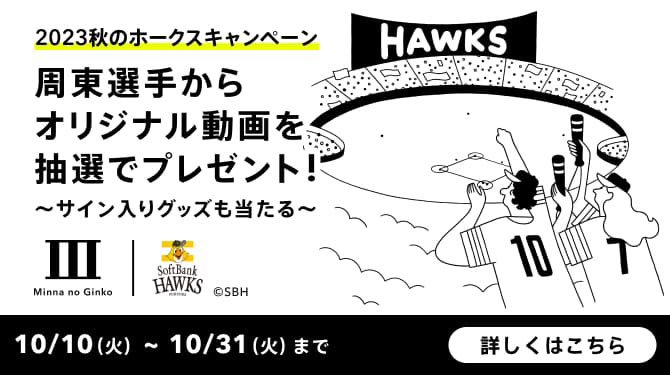 みんなの銀行では、ホークス応援Boxキャンペーンを開催中!第5弾キャンペーンでは、ホークス応援Boxへご入金された方の中から抽選で、周東選手からオリジナル動画やホークス選手のサイン入りグッズが当たります!ぜひこの機会にみんなの銀行口座を利用して、素敵な景品をゲットしましょう!