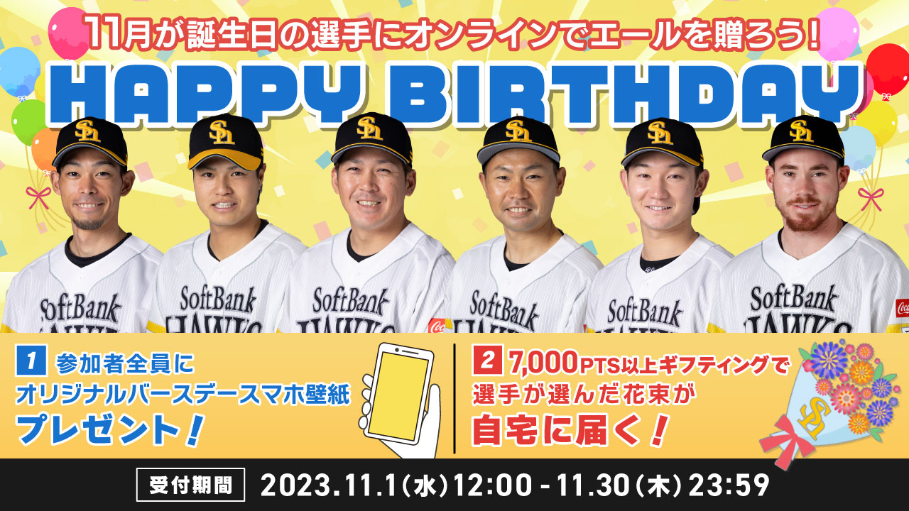 11月1日(水)~30日(木)の期間、11月生まれの選手へエールを送るギフティングイベントを開催します。専用サイトからメッセージやギフティング用のスタンプで応援の気持ちを投稿してください。イベントの参加者全員がもらえる限定プレゼントや、選手が選んだ花束のお返しもご用意。お誕生日を迎える選手にたくさんのエールのプレゼントをお待ちしています!