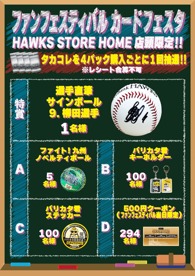 カードパックを4パック購入ごとに1回抽選(合算なし)できます!特賞には柳田選手の直筆サインボールも!