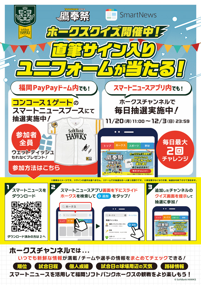 ファンフェスティバル2023「鷹奉祭」開催記念!「スマートニュース/ホークスチャンネル」で選手の直筆サイン入りユニフォームが当たるクイズ&抽選会を開催!