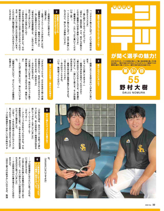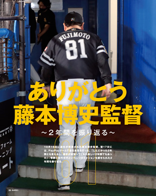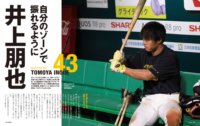 巻頭特集では、井上朋也選手にインタビューを行いました。今シーズンはプロ初ヒット、初ホームランを放ち、1軍デビューを果たした井上選手。小久保監督が「2軍と同じアプローチで結果が残せていた」と期待を寄せる右の大砲の1人。秋季キャンプでは、さらにレベルアップを図り「来シーズンは成長した井上朋也になって帰って来ますので、楽しみにしていてください」と、意気込みを語ってくれています。