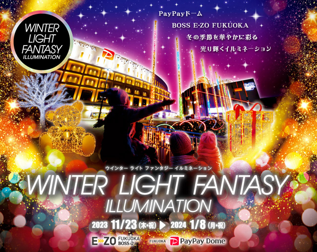 PayPayドームに今年も冬を華やかに彩るイルミネーションが登場します。約20万球の光に包まれ、美しく輝くイルミネーション「WINTER LIGHT FANTASY ILLUMINATION(ウィンターライトファンタジーイルミネーション)」を開催。11月23日(木・祝)から2024年1月8日(月・祝)までの期間限定で、点灯時間は17:00~22:00です。この機会にPayPayドームとBOSS E・ZO FUKUOKAへぜひお越しください!