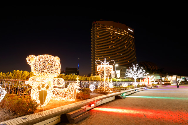 PayPayドームのイルミネーション最大のポイントは、7ゲート前にある全長約60mの「ホークスみんなのガーデン」。高さ5m50cmの白く輝くツリーを中心に、ギフトボックスやテディベアのオブジェは、素敵なフォルムが魅力です。1点ずつ手作業で制作した芸術作品のような大型イルミネーションとなっています。フォトスポットとしてぜひご家族やご友人と撮影してください。