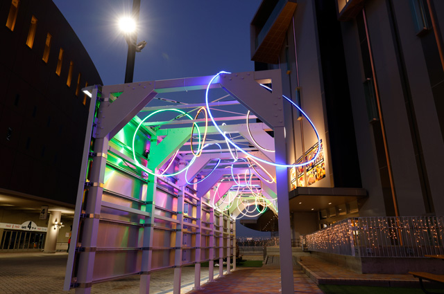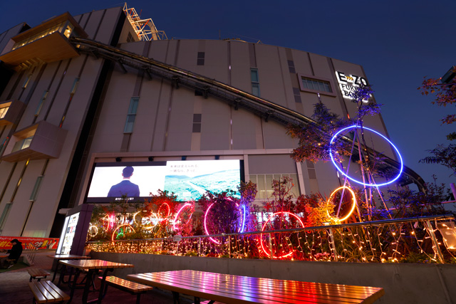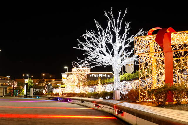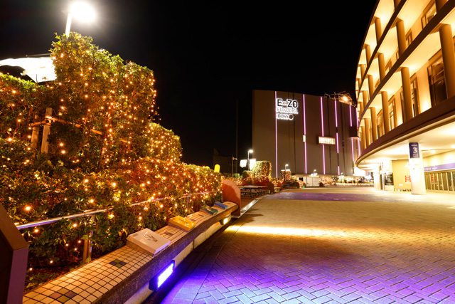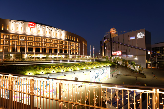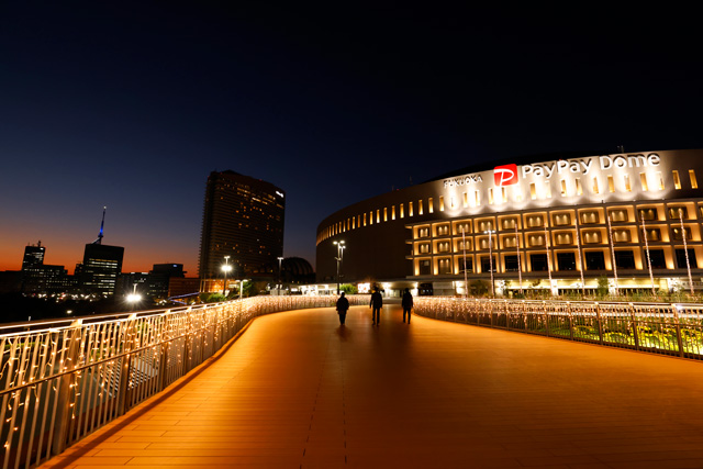 PayPayドームを正面から撮影したいなら、5ゲート前のマークイズ福岡ももちへの連絡橋がおすすめです。さらに、BOSS E・ZO FUKUOKA前も光り輝くイルミネーションで彩られています。