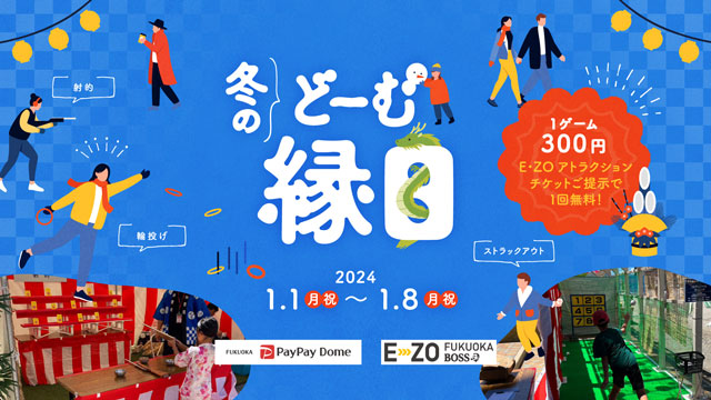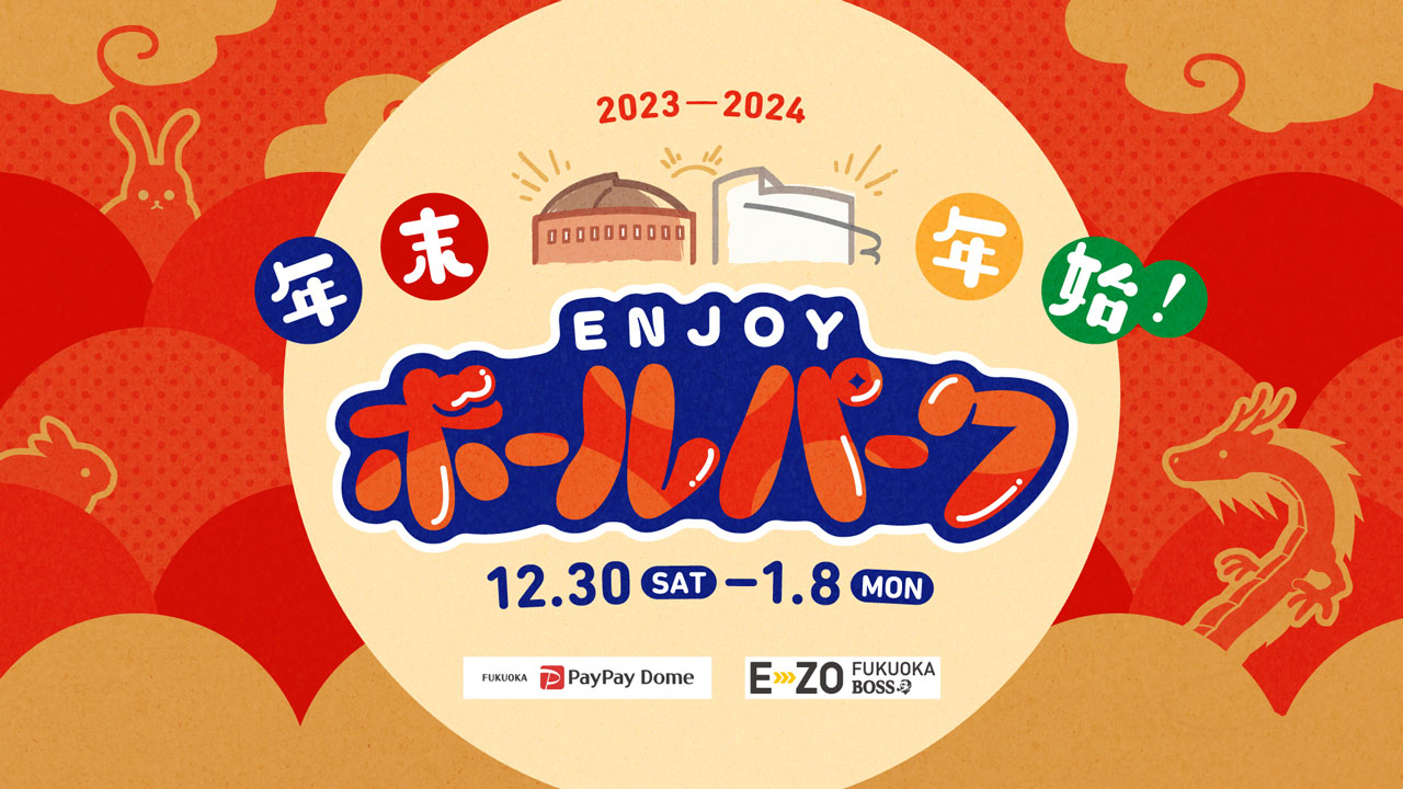 12月30日(土)~2024年1月8日(月・祝)の期間、PayPayドームとBOSS E・ZO FUKUOKAでは「年末年始!ENJOY ボールパーク」と称してさまざまなイベントが目白押し!フィールドでキャッチボールや写真撮影が楽しめる“PayPayドームフィールド開放”に、お子さまが楽しめる“わくわくキッズトレイン” “冬のどーむ縁日”、さらに、ロボスクーターがドームのデッキに登場!?2023年の遊び納めも、2024年の遊び始めも、ぜひPayPayドームとBOSS E・ZO FUKUOKAで♪