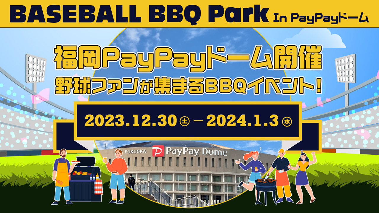 PayPayドームにBBQ場が年末年始の期間限定でOPEN!その名も「ベースボール BBQ Park」!おなかいっぱい楽しめるメニューを取り揃えて、皆さまのご来店をお待ちしております。コースはすべて2時間の飲み放題がついており、手ぶらでゆっくりBBQを楽しむことができます。ご家族やお友達でBOSS E・ZO FUKUOKA、PayPayドームで遊んだ後はBBQ場で非日常な年末年始を過ごしてみませんか?
