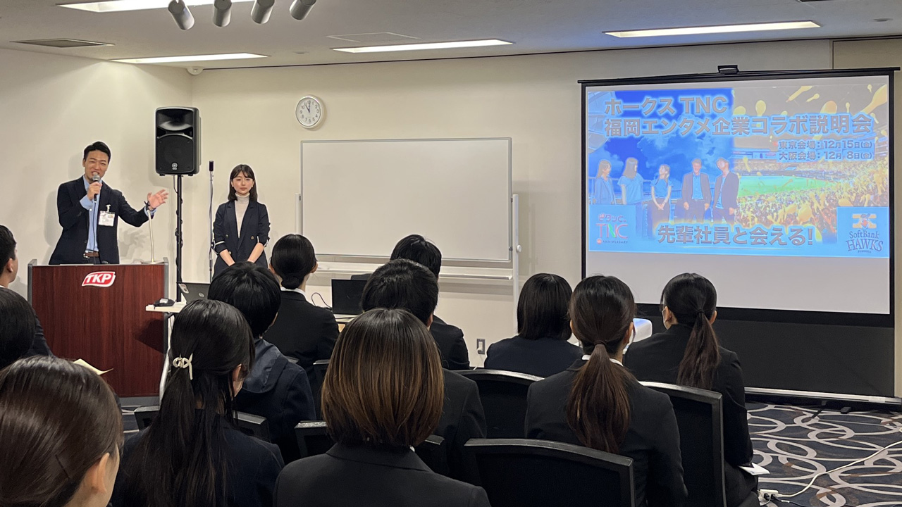 福岡ソフトバンクホークス株式会社は、12月に福岡のフジテレビ系列局の株式会社テレビ西日本(TNC)と合同で、2025年に大学・大学院卒業見込みの学生を対象に「ホークス TNC 福岡エンタメ企業コラボ説明会」を初開催いたしました。