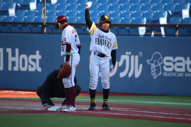 先手を奪ったのはホークスジュニアだった。初回に両チームとも得点圏の走者を生かせず、迎えた2回。先頭打者として打席に入った上村優真選手が右翼ポール際のフェンスを超えるソロを放って先制に成功。5番を打つ主砲の一発に、ベンチも、スタンドも大盛り上がりとなった。