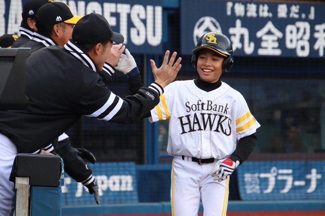 前日の東北楽天ゴールデンイーグルスジュニアとの一戦に惜敗していたホークスジュニア。TQB(得失点差率)によるワイルドカードでの準決勝進出のためには大量点での勝利が必須だった。帆足監督が選手にかけた「10点取ろう」のゲキに応える有言実行の猛攻で、準決勝進出を掴んだ。