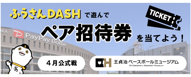 キャンプ期間中、新機能「バッジ」にて対象のバッジを獲得すると、抽選で5組10名様に4月公式戦ペア招待券と王貞治ベースボールミュージアム招待券がセットで当たるキャンペーンを実施します。ご参加いただいた方全員に参加賞もございます!