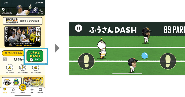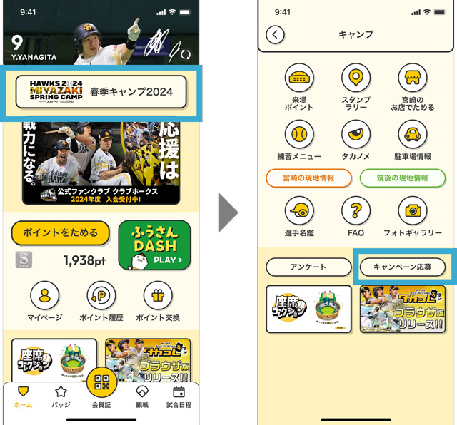 宮崎キャンプ地の全3か所に設置された二次元コードを全て読み取ると、タカポイント200ptがもらえます。さらに、新機能「バッジ」でデジタルバッジ「スローガン2024」が宮崎キャンプ限定で先行獲得できます!