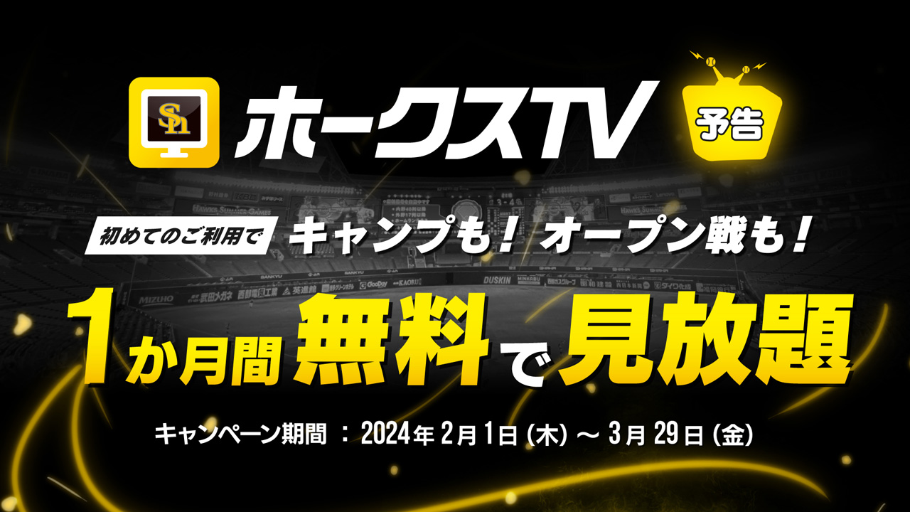 ホークスTVでは2月1日(木)より月額プラン(900円/税込)を1か月間無料で体験できるキャンペーンを実施します。春季キャンプ、オープン戦、1~4軍公式戦が見放題!この機会にホークスTVを楽しもう!
