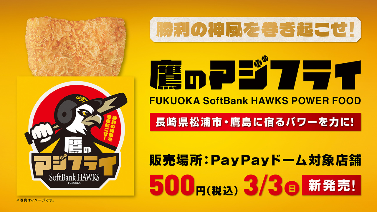 福岡ソフトバンクホークス株式会社(本社:福岡県福岡市 代表取締役社長 CEO:後藤芳光)と株式会社三陽(本社:福岡県福岡市 代表取締役社長:長谷煌一郎)、長崎県松浦市(市長:友田吉泰)は、このたび3者がタッグを組み、3月3日(日)より福岡PayPayドームの新グルメ「鷹のアジフライ」を販売することをお知らせします。