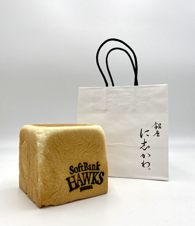 独自開発のアルカリイオン水を仕込みに使用することで、小麦粉、生クリーム、バターなど食材の持つ旨味を絶妙に引き出した1斤サイズの食パンです。ホークスロゴの焼き印入り☆お土産にどうぞ♪1日限定50個です。