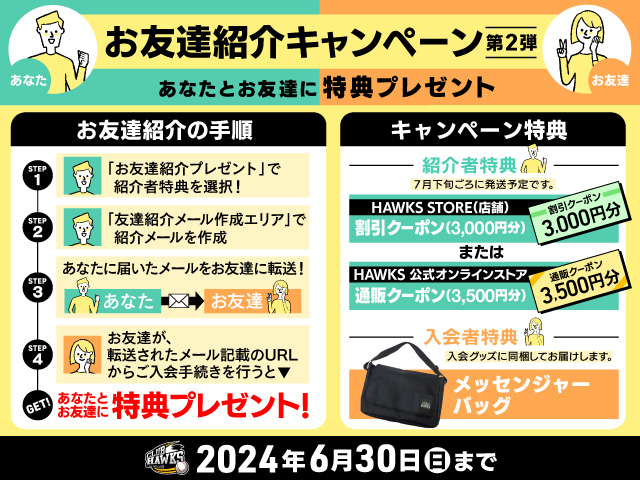 期間中にクラブホークスにお友達やご家族をご紹介いただいた方には、グッズショップで使えるクーポンを最大で3,500円分、そして紹介でご入会いただいた方には、メッセンジャーバッグをもれなくプレゼントいたします。クラブホークスメンバーを増やして一緒にホークスを応援しよう!