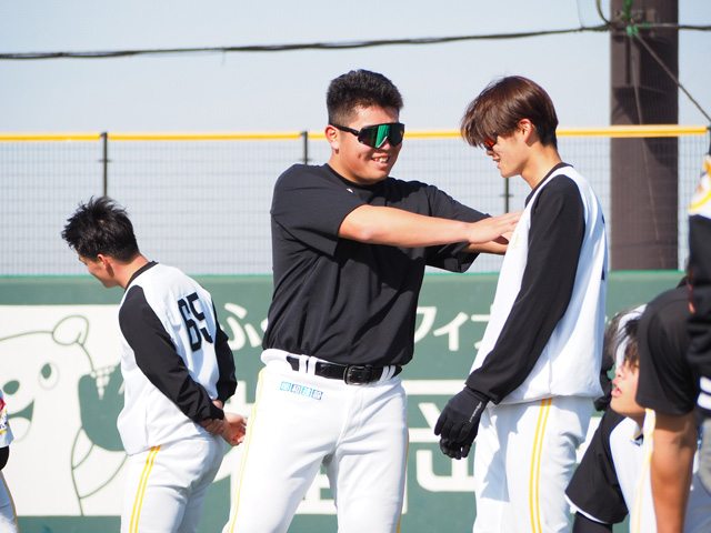 星野恒太朗投手は、バッターに投げるのが約3ヶ月ぶりだったようで「全然感覚戻ってない」とやや苦笑い。それでも、福大大濠高校の後輩である藤田悠選手との“大濠対決”では、藤田選手が「完敗です」と大卒の先輩の貫禄に脱帽していました。
