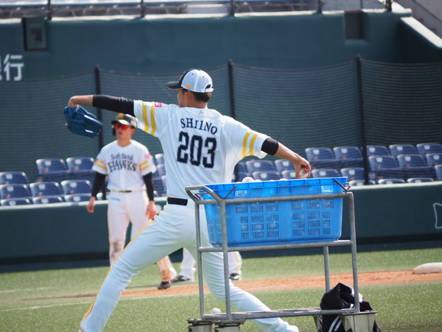 プロ入り後初めて打撃投手を務めたルーキーの宮里優吾投手は、打者のバットをへし折りそうなほどの強く速い球をガンガン投げ込んでいました。