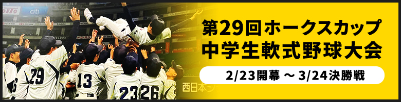 NPO法人ホークスジュニアアカデミーは、2024年2月23日(金・祝)~3月24日(日)に福岡市内の中学生で構成される軟式野球71チームのNo.1を決定する「2024年 第29回ホークスカップ中学生軟式野球大会」を開催します。