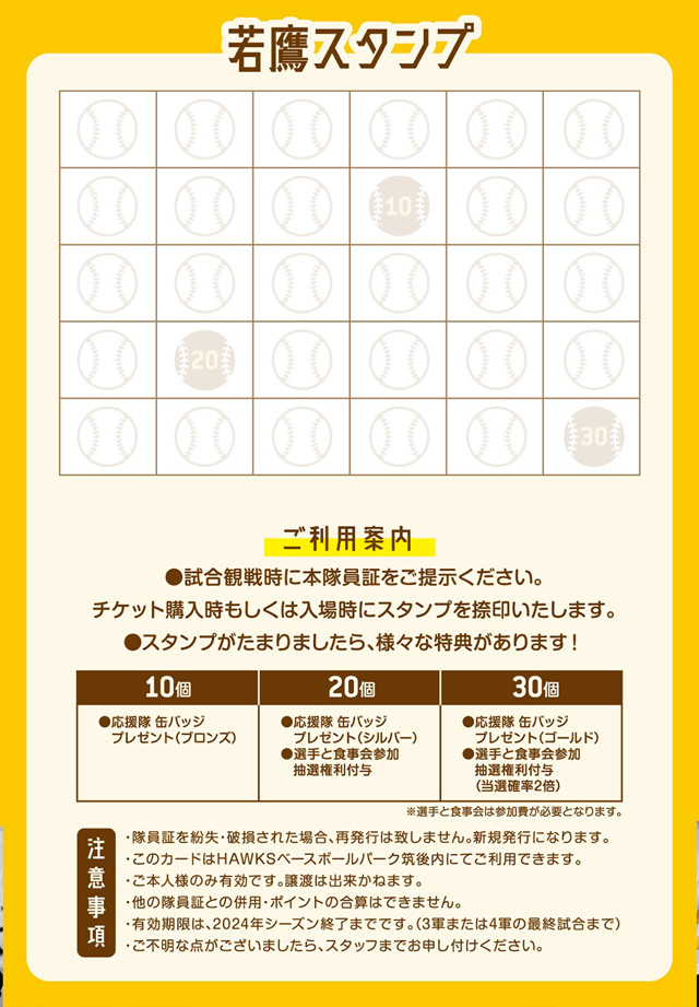若鷹応援隊の皆さまには、隊員証&若鷹スタンプカードを発行します。3軍戦・4軍戦のチケット購入時にカードを提示するとスタンプをゲット!スタンプの個数に応じて、豪華特典をプレゼントします☆