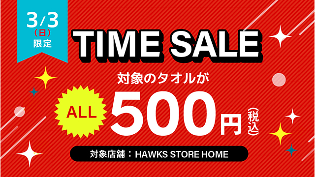 2024年シーズンのスタート記念として、3月3日(日)にタオルのタイムセールを開催します!パーソナルスローガンタオルや2023ピンクフルデーフェイスタオル、ハイブリッドフェイスタオルなどのセール対象品が全て500円(税込)に!