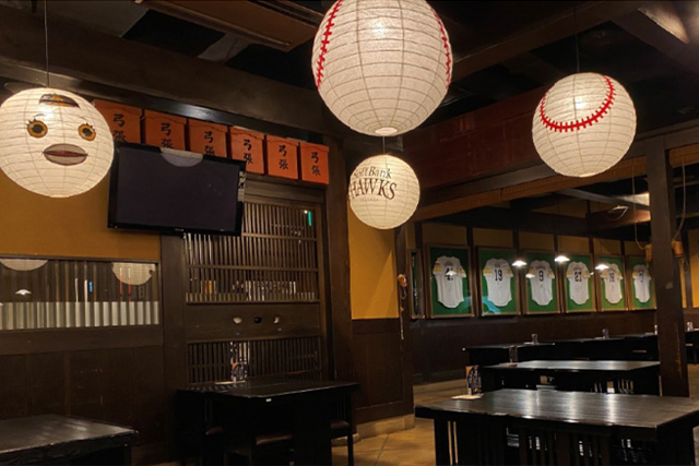 福岡ソフトバンクホークスのオフィシャル居酒屋が「とりかわ竹乃屋 鷹正」になってリニューアルオープン。店舗内の装飾はそのまま継続し、月間80万本売り上げる“博多ぐるぐるとりかわ”を中心におつまみや定食メニューなどを幅広くご用意。お座敷もございますので、ご家族連れでのご利用や各種宴会にもピッタリ。野球観戦の前後に、ホークスグッズに囲まれ広々とした空間でゆっくりとお過ごしいただけます。