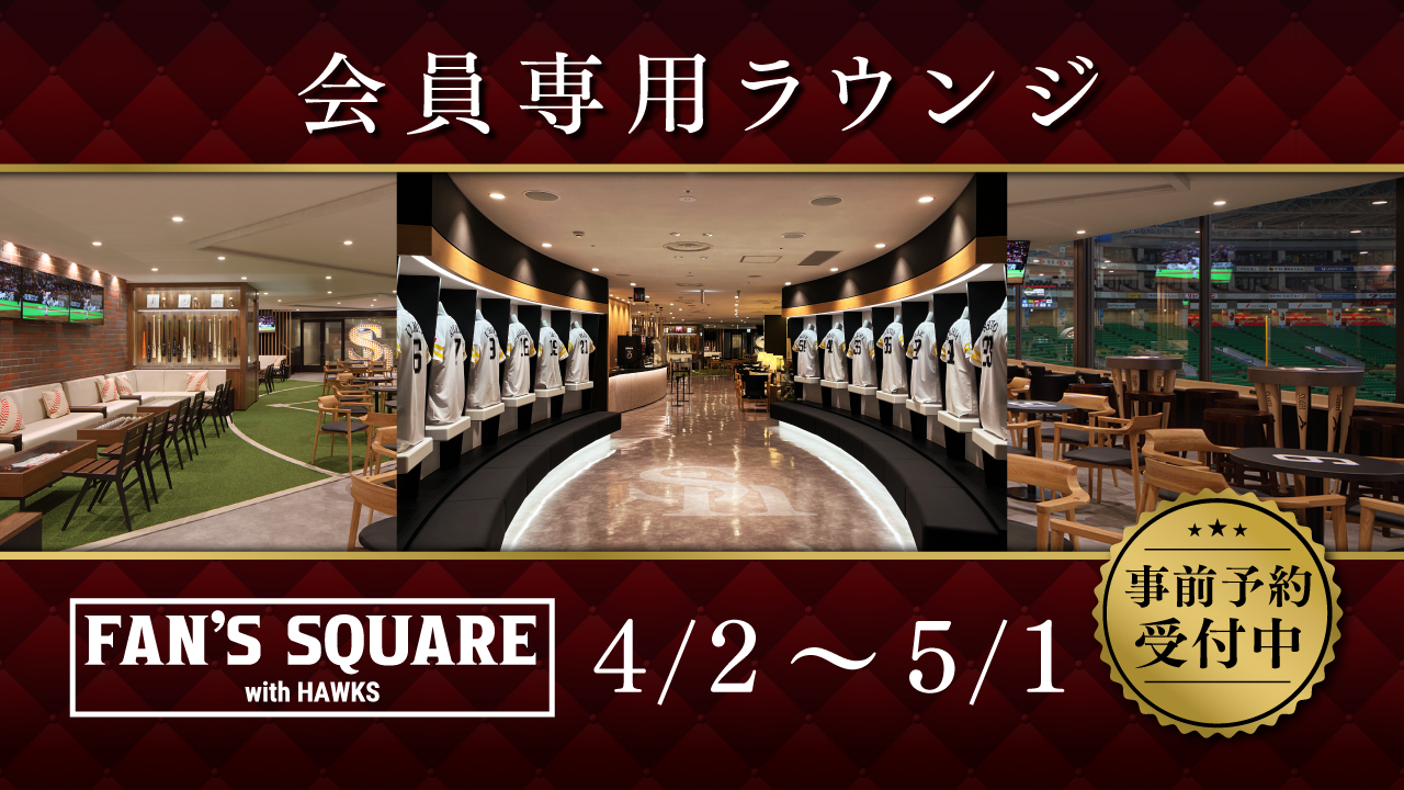 タカポイントでは、4月2日(火)~5月1日(水)にPayPayドームで開催する試合における会員専用ラウンジ「FAN’S SQUARE」事前予約の抽選受付を開始します。試合開始前のご利用は事前予約(抽選)制です。当日の観戦チケットをお持ちのダイヤモンド・プラチナステージ会員様のみお申し込みいただけます。