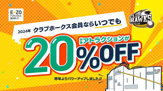 クラブホークス会員は対象アトラクションが20%OFFと昨年よりパワーアップ☆さらにイベントデーはなんと30%OFF!入会時にお送りする『クーポンカード』記載のクーポンコードで割引となります。