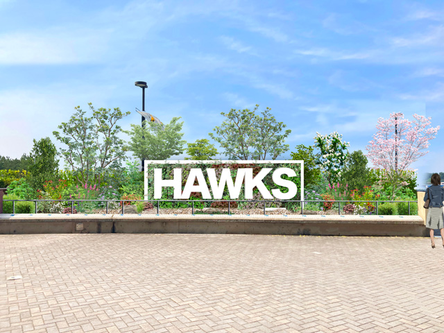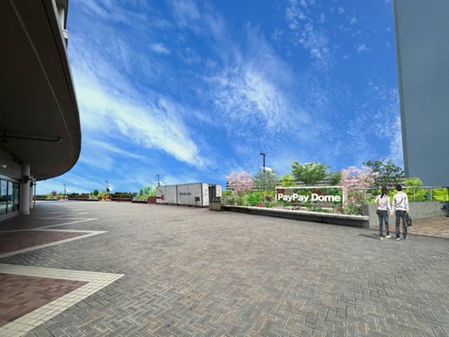 PayPayドーム外周デッキの4ゲートから2ゲートへ向かう海側の植栽が、自然や季節を感じられるガーデンに生まれ変わりました。2ゲート前と4ゲート前には、撮影スポットも登場!BOSS E・ZO FUKUOKAや野球観戦に来たときはぜひ立ち寄って記念に撮影してください♪