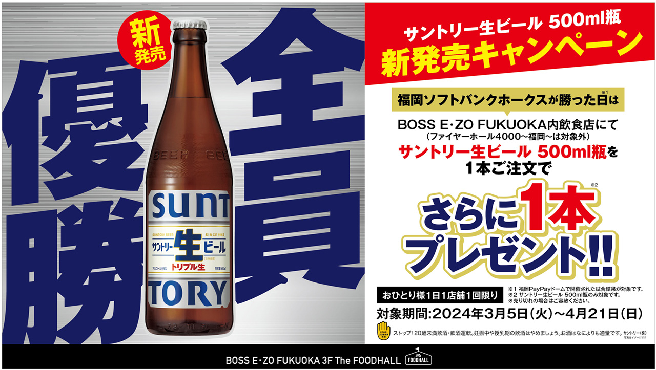 BOSS E・ZO FUKUOKA 3階 「The FOODHALL」では、サントリー株式会社で3月5日(火)より発売の「サントリー生ビール500ml瓶」をお得に提供するイベントを3月5日(火)~4月21日(日)に開催します。イベント期間中、対象店舗ではPayPayドームでのホークス主催試合でホークス勝利後は「サントリー生ビール500ml瓶」を1本注文するともう1本プレゼント! 試合後はThe FOODHALLで、ホークスの勝利を祝して「サントリー生ビール」で乾杯しましょう♪