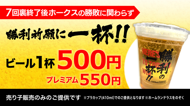ホークスの勝敗に関わらず、7回裏終了後から通常650円のところ500円で販売! ※プレミアムビールについては「勝利の一杯」開催時、通常700円のところ550円で販売いたします。