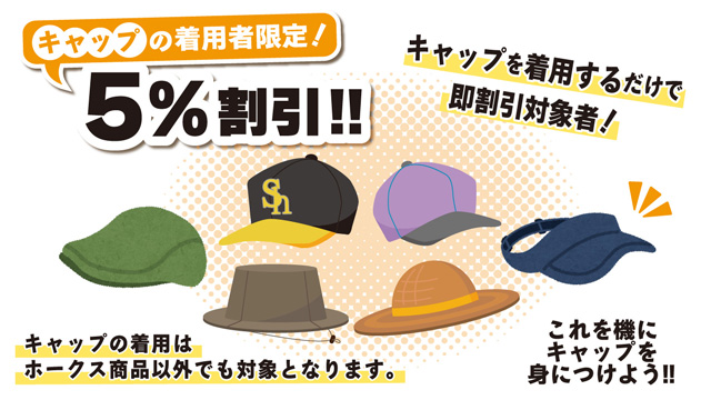 HAWKS STORE各店舗でキャップを着用してグッズをご購入いただくと会計時に5%オフになるイベントを開催します!お気に入りのキャップを被ってお越しください♪