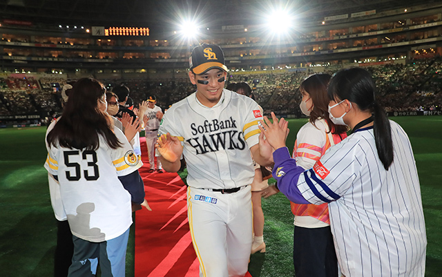 試合前にはグラウンドにWANIMAが登場!出身地である熊本県での「ファイト!九州デー」開催を記念し、ホークス選手へ熊本県特産品を贈呈します。