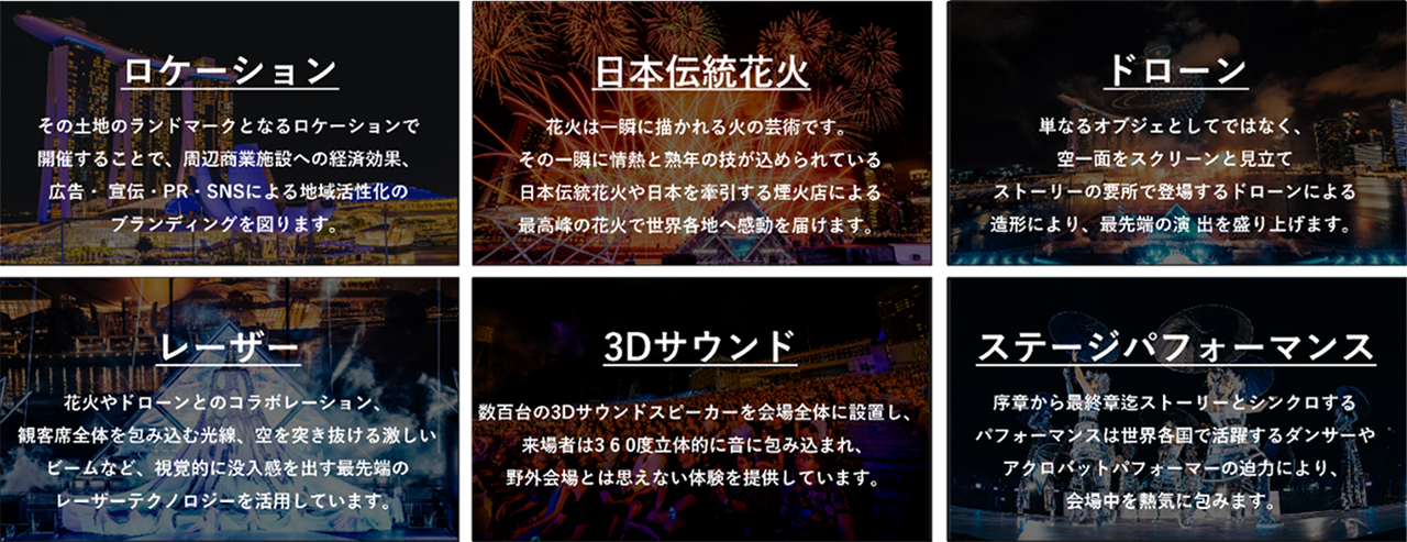 STAR ISLANDはシンガポールやサウジアラビアなど、世界各国で公演を重ね、世界中の方々からパフォーマンスに対して高い評価を受けてまいりました。以下6つが、STAR ISLANDを構成する要素です。
