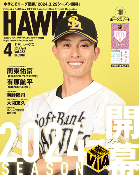 見どころ満載の4月号は、試合結果が書き込める月刊ホークスオリジナル「ホークスノート」が付いて特別定価890円で全国書店にて発売中!