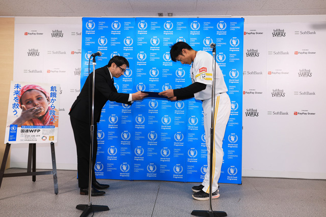 柳田悠岐選手が2019年より取り組んでいる国連WFPへの成績連動型寄付(1本塁打につき15万円)が今年で6年目を迎えます。この度、過去5年間の支援について国連WFP協会より感謝状が贈呈されました。