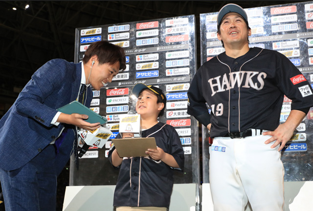 ホークス勝利時、ヒーロー選手にインタビューを行っていただきます。