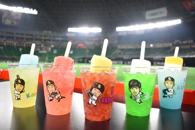 4月2日(火)千葉ロッテ戦でのPayPayドーム開幕戦にあわせて新メニューが登場♪新しい選手グルメとして、板東湧梧投手のパフェと山川穂高選手のお弁当を販売開始!また、選手のイラストが描かれたカップや球界初のメガホン型容器も新登場。さらに、ドーム新名物「鷹のアジフライ」も価格を変更し販売します。今年もたくさんのグルメを食べてホークスを応援しよう!
